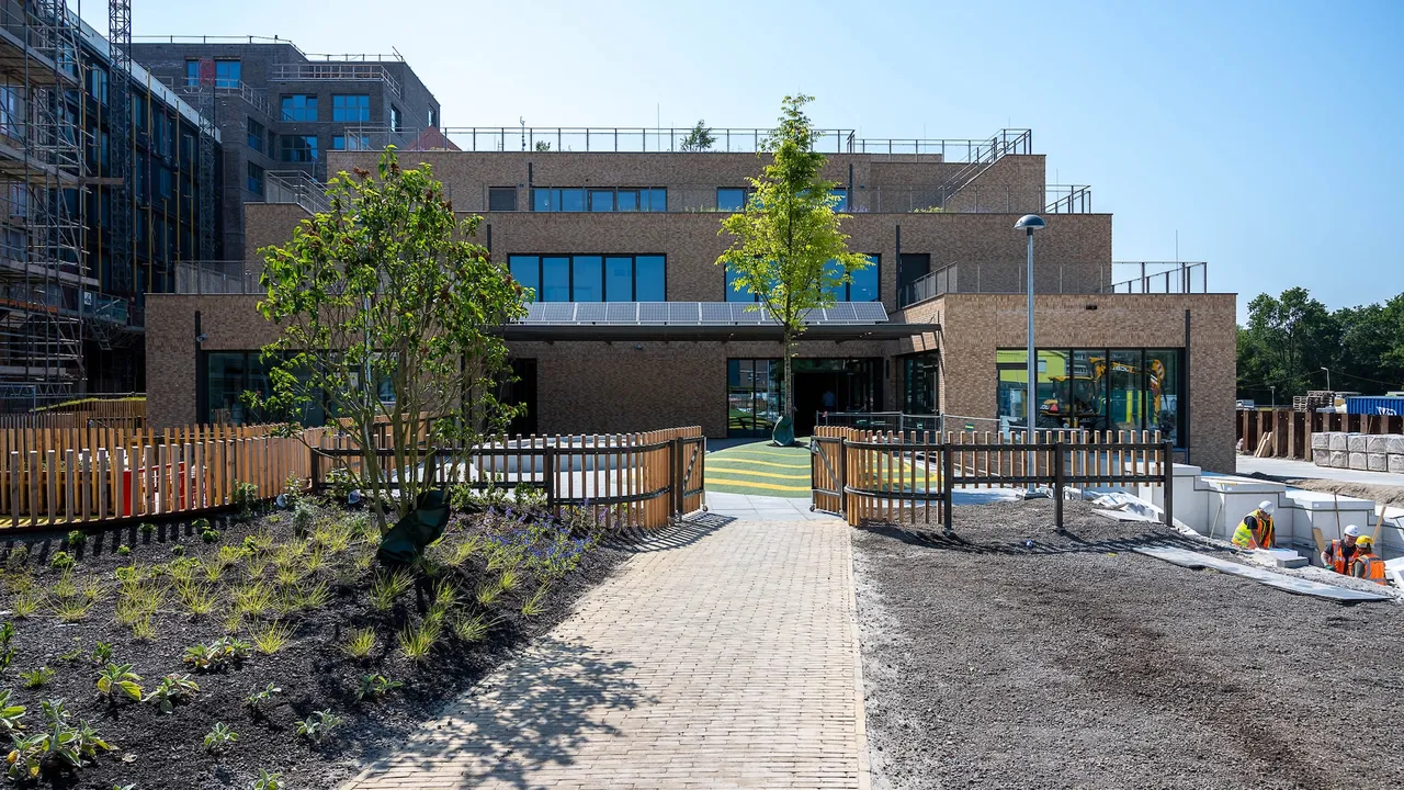De ruimten zijn zo vormgegeven dat gezond en duurzaam gedrag wordt gestimuleerd: er is veel daglicht, zicht op groen en een afgewogen mix van open leeromgevingen en rustige plekken om te werken. Buiten sluit het gebouw aan op een rijk beplant schoolplein en meerdere groene dakterrassen, waardoor leren, spelen en natuurbeleving in elkaar overlopen.